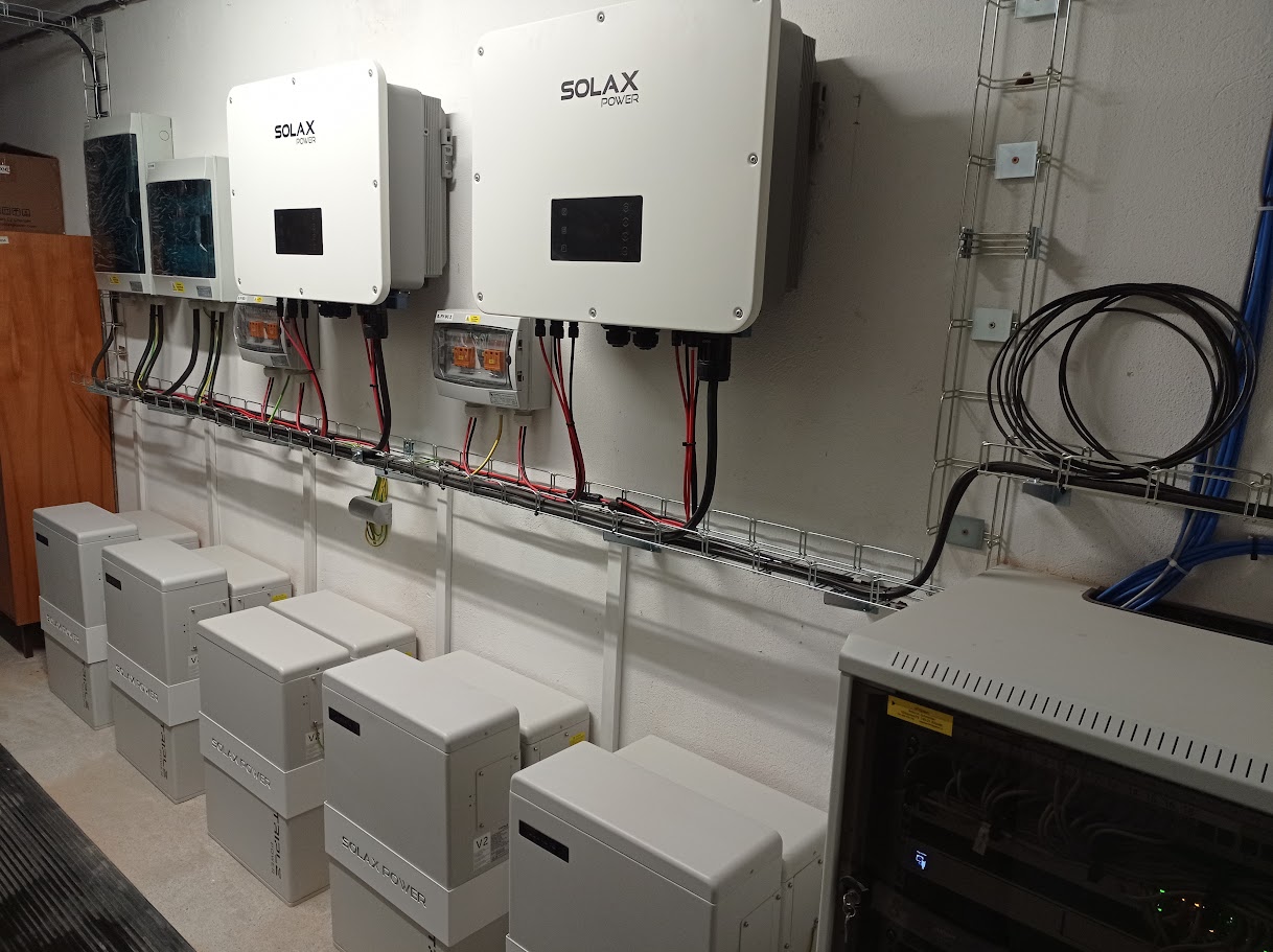 Technologie FVE + bateriové úložiště je umístěna v technické místnosti. Jedná se o 10 baterií SOLAX T5,8 kWh, celkem 58 kWh a 2 střídače AC s výkonem 2 x 25 kWh. V případě nutnosti nouzového odpojení FVE jsou naintalována 2 stop tlačítka. Jedno je umístěno na zdi haly při vstupu do areálu a druhé před vstupem do technické místnosti.